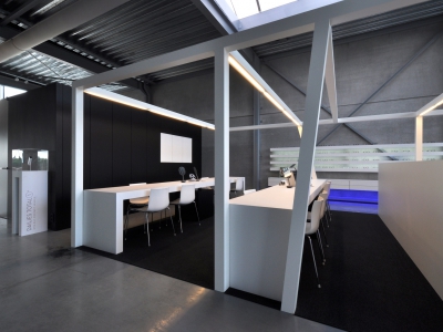 Deze optiekzaak trekt de aandacht op een perceel waarvan het straatbeeld voordien bepaald werd door een bestaande molenromp, opgenomen als bouwkundig erfgoed. Een zwart bouwblok, dat de optiekzaak en bijhorend bureel herbergt, gaat als ‘hoofdbouw’ a.h.w. de concurrentie aan met de wit geschilderde molenromp, met behoud van de waardigheid van beide bouwwerken. Het geheel wordt opgevat als één bouwlaag met daarin een aan de dakstructuur opgehangen beperkte bureelruimte met overzicht over de volledige verkoopsruimte.