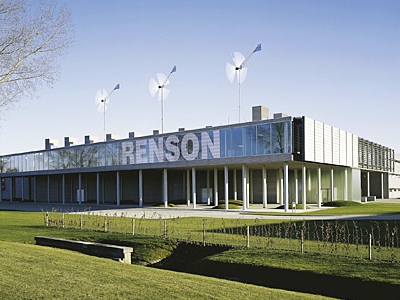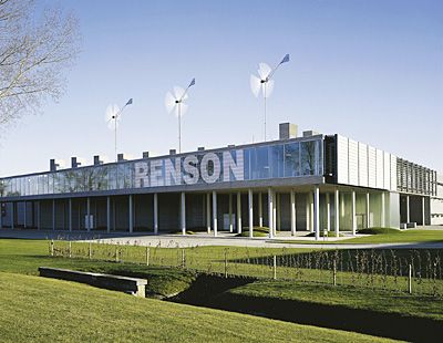 Het bedrijfsgebouw Renson is ongetwijfeld één van de meest beeldbepalende industriegebouwen langs de autosnelweg Gent -Kortrijk. Op een smalle spie tussen het reeds aanwezig magazijn en de autostrade kreeg Crepain de opdracht een kantoorgedeelte te ontwerpen dat tevens de uitdrukking moest zijn van het bedrijf dat gespecialiseerd is in nieuwe technologieën op het gebied van ventilatie en zonnewering. Door het kantoorvolume op zes meters hoge kolommen te plaatsen sloot het aan bij de dakrand van het gesloten magazijn. Er is echter een tussenstrook voorzien waardoor ook de achterzijde van het kantoor een beglazing kreeg. Oorspronkelijk was onder het volume een open ruimte ontworpen als een tuin, en de plaats voor de inkomhal en een cilindervormige koker voor trappen en liften.