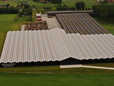 De site van het Houtimportbedrijf Vandecasteele NV paalt aan de zuidzijde van de grote verkeerswisselaar van Aalbeke. Met grote zorg werden de houten loodsen ontworpen in samenwerking met architect Arthur De Geyter . De mooie inpassing in een glooiend landschap geeft aan deze site een uitzonderlijk karakter. ©Alesa Dam ©Made in West-Vlaanderen